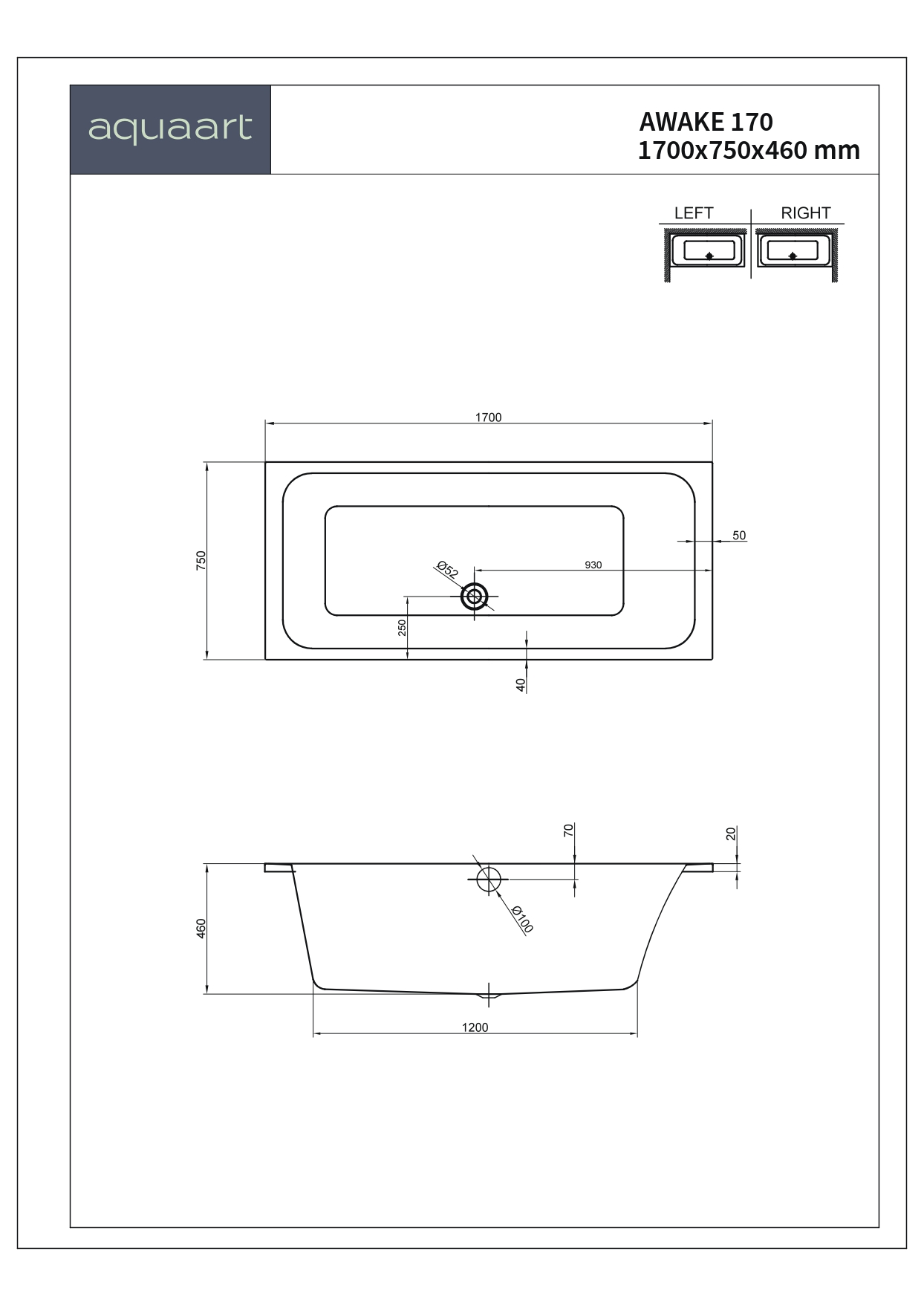 AWAKE 170/L PRAVOKUTNA KUPAONSKA KADA 1700x750 mm
