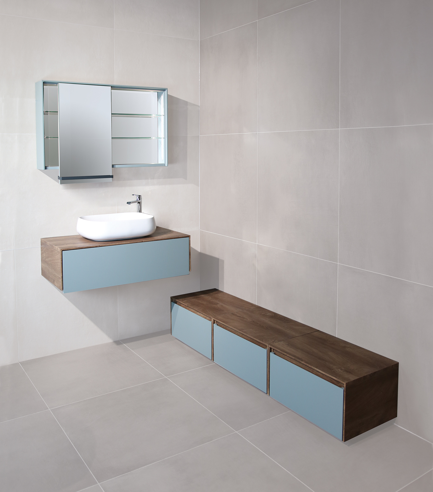 Kupaonski ormarić u dekoru cognac i fjord unosi toplinu i lako se kombinira s drugim elementima zahvaljujući modularnom dizajnu. Soft close sistem zatvaranja omogućuje tiho i lagano korištenje. Čiste linije uklapaju se u razne stilove uređenja. Praktičan izbor za urednu i skladno uređenu kupaonicu.