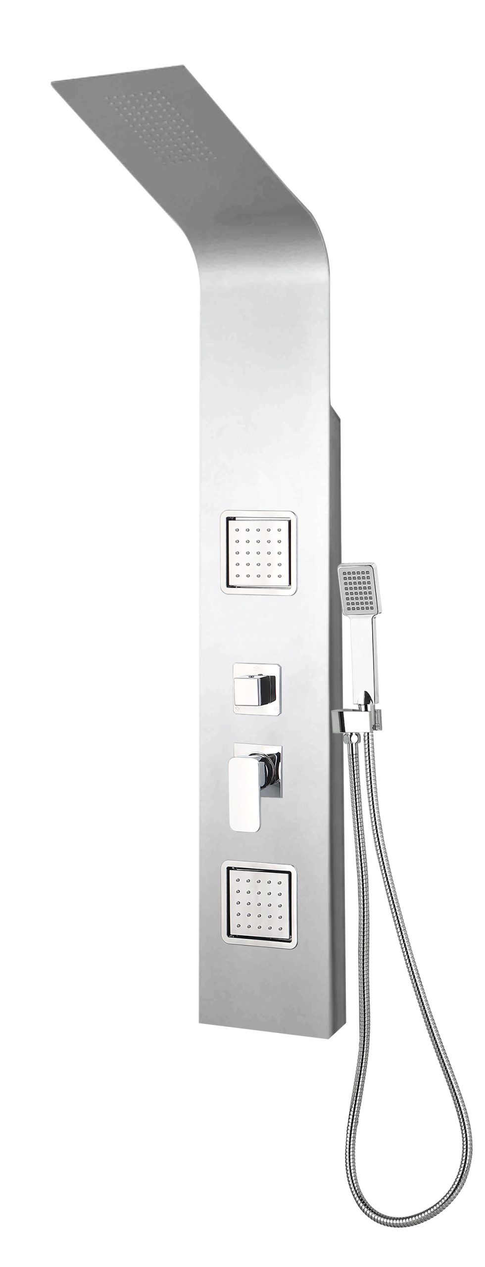 Tuš panel 140x22 cm izrađen od visokokvalitetnog PVC-a u elegantnoj srebrnoj boji. Opremljen gornjim tušem s 50 mlaznica, leđnom masažom s 2 seta mlaznica, ručnim tušem s 1,5 m crijevom, držačem ručnog tuša i kvalitetnom miješalicom. Unesite luksuz i udobnost u svoju kupaonicu s ovim modernim i funkcionalnim tuš panelom.