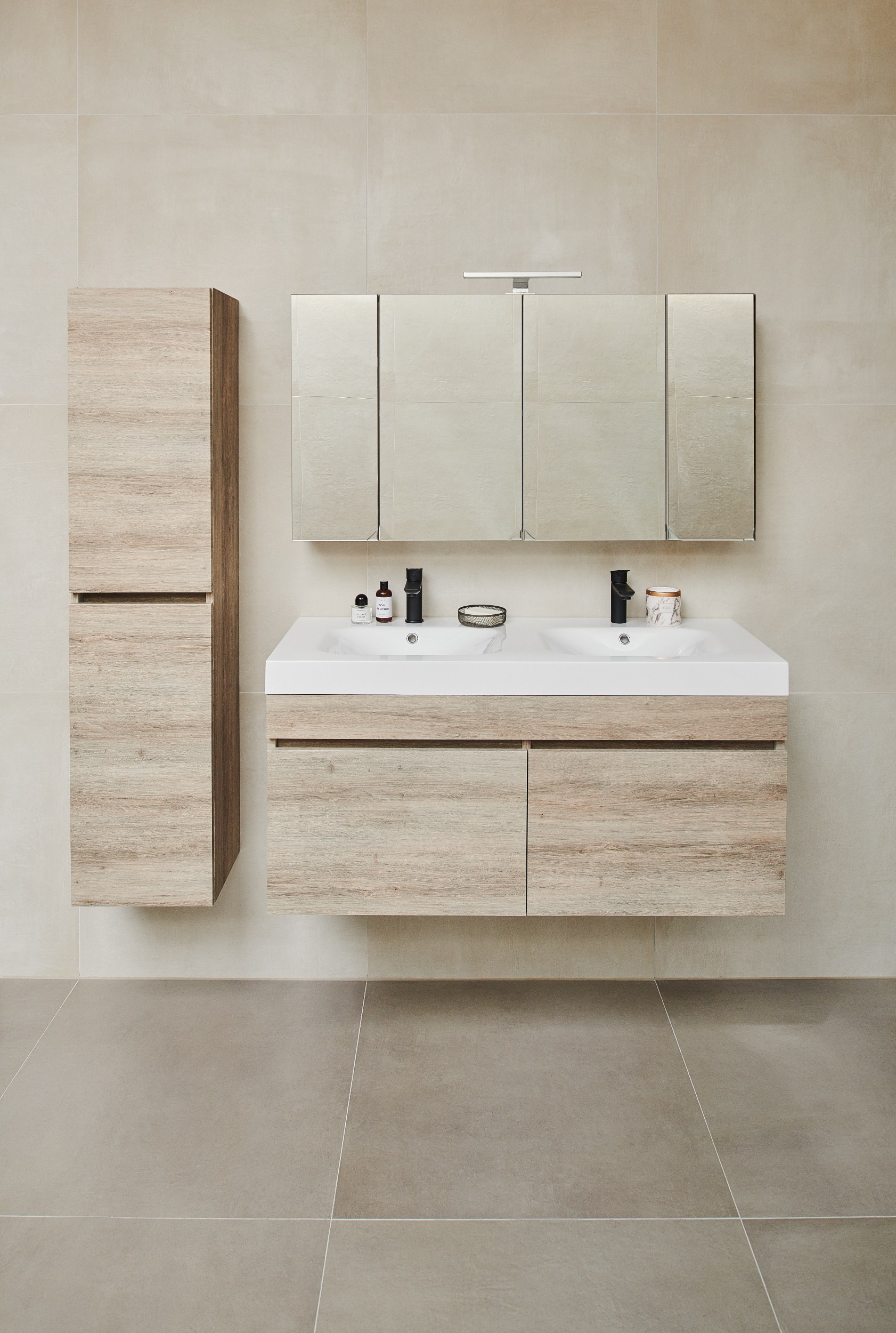 Donji kupaonski ormarić u dekoru grey mara opremljen dvjema dubokim ladicama i dvostrukim ugradnim umivaonikom od umjetnog sjajnog mramora, pruža obilje prostora za odlaganje i praktičnost, dok soft close sistem zatvaranja osigurava tiho i ugodno korištenje.