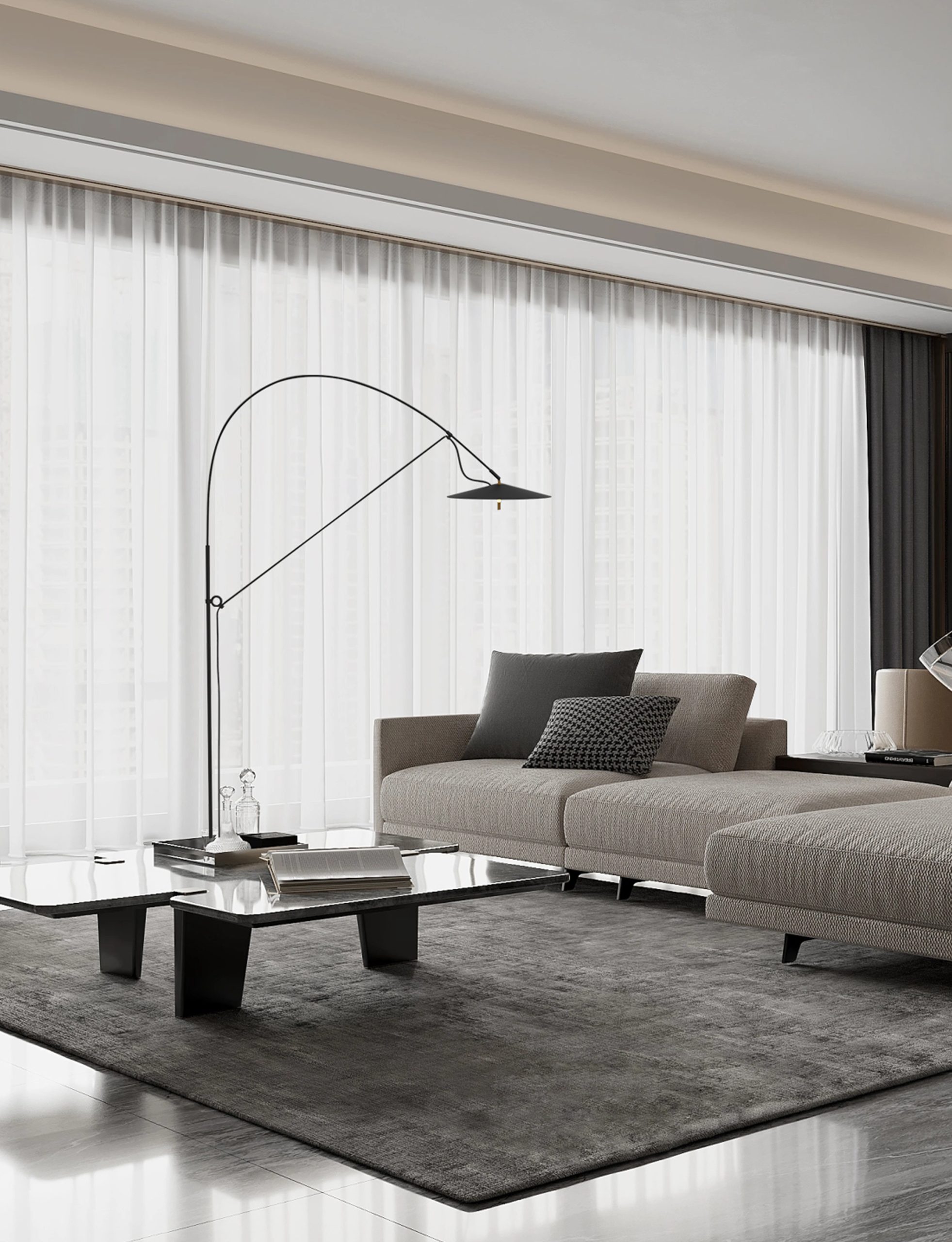 LUMORA podna svjetiljka reinterpretira klasičnu luk-siluetu kroz profinjenu, minimalnu formu. Vitka konstrukcija i pomaknuto svjetlosno tijelo stvaraju vizualnu lakoću i precizno usmjereno osvjetljenje. Toplo svjetlo (3000K) može se prilagoditi četverostupanjskim podešavanjem intenziteta, čime svjetiljka postaje aktivan element u oblikovanju atmosfere prostora. U mat crnoj izvedbi, unosi skulpturalni karakter i suzdržani akcent u suvremene interijere.