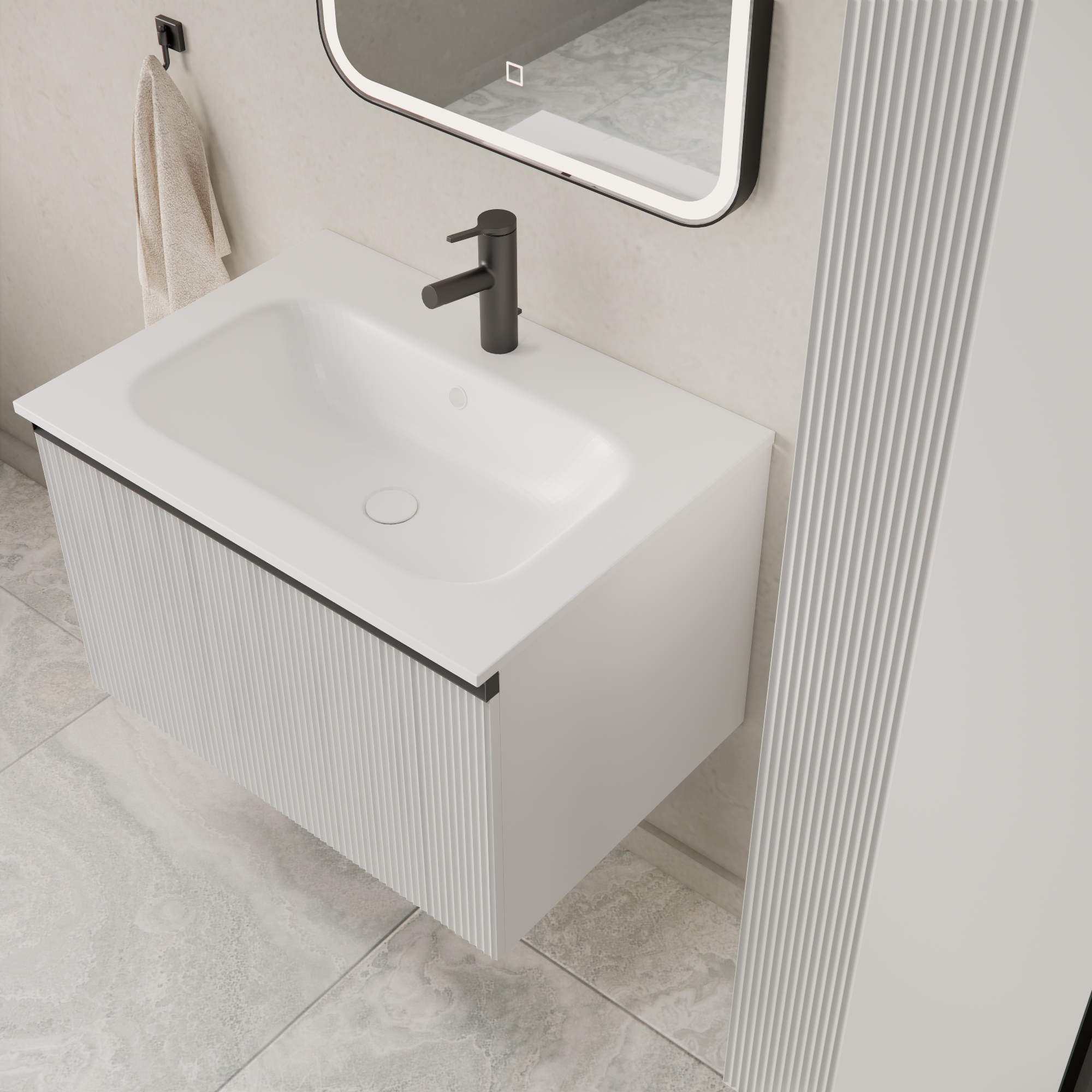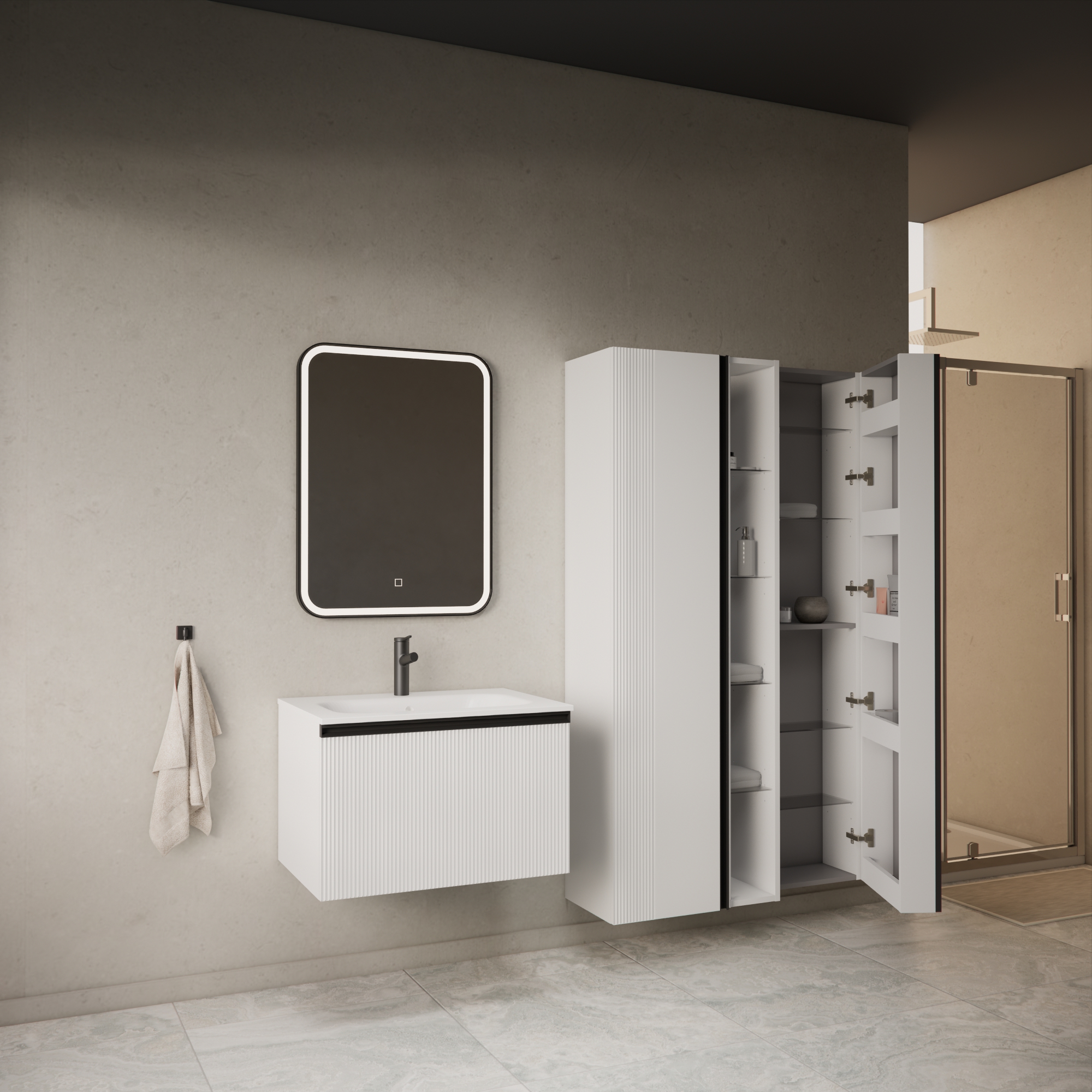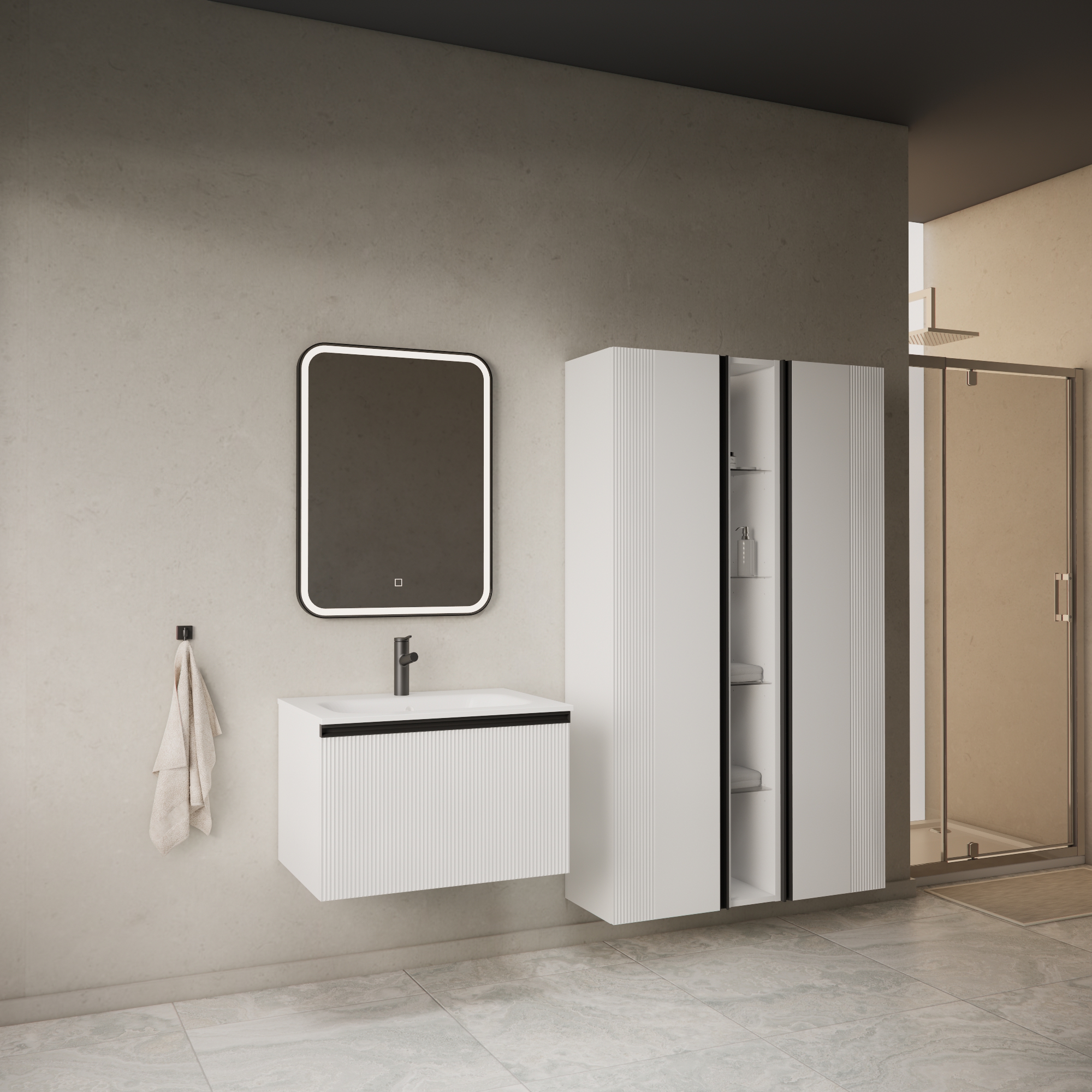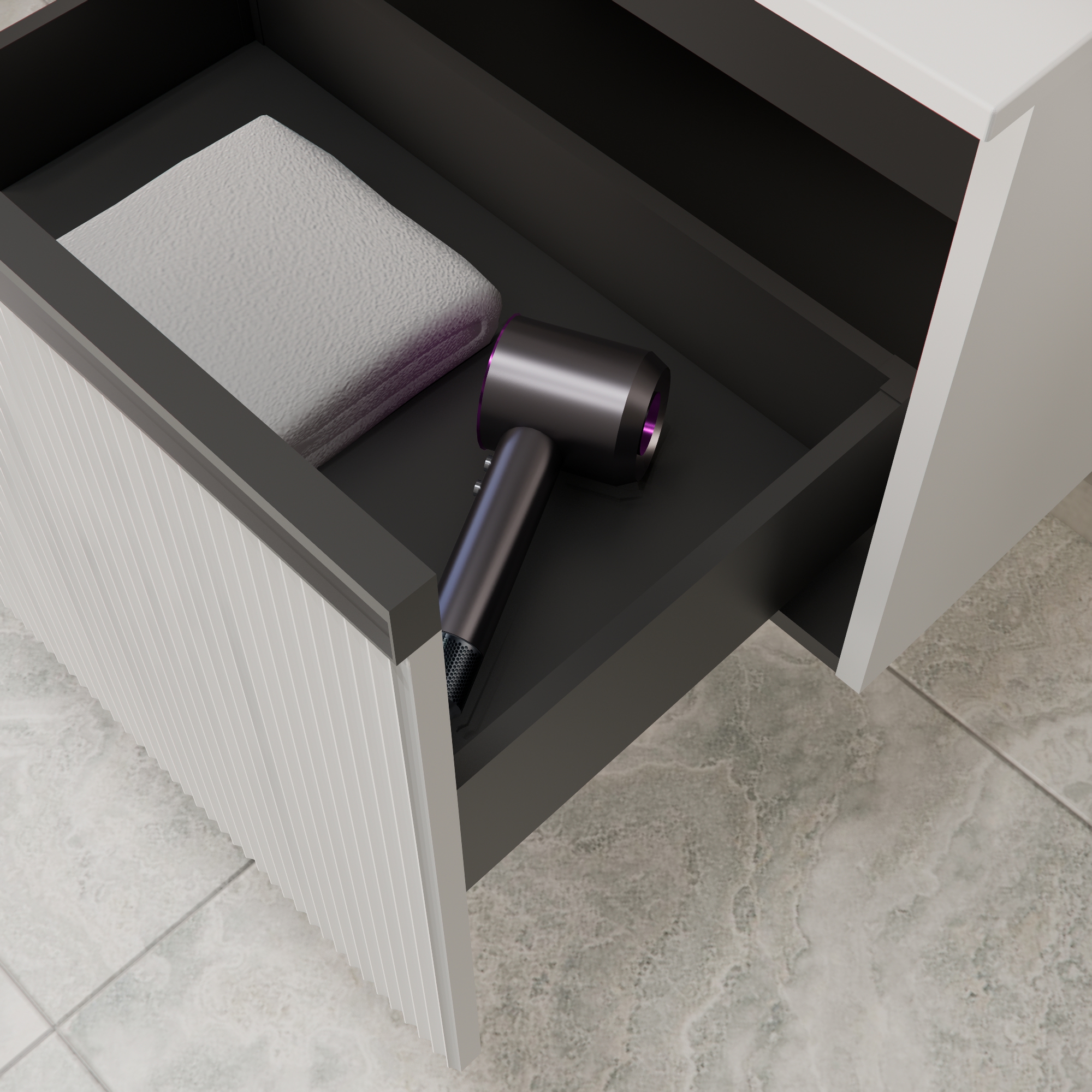 Donji ormarić kupaonskog kompleta Mirage u dekoru bijeli mat s crnom ručkicom opremljen jednom dubokom ladicom. Sofisticirani dizajn skladno se stapa sa suptilnom formom umivaonika izrađenog od lijevanog mramora. Umivaonik se prodaje odvojeno - šifra artikla 002569.