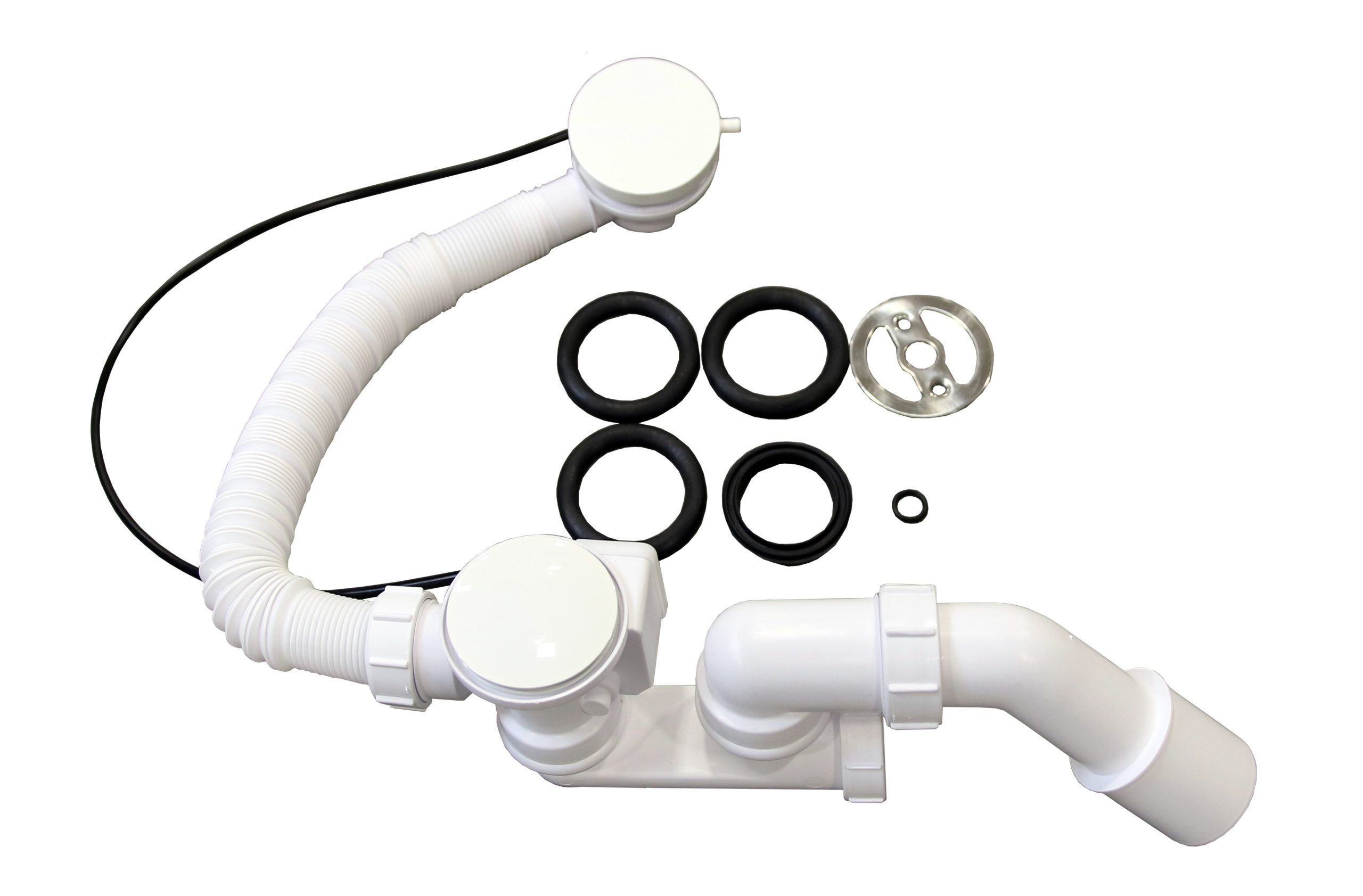 Sifon za samostojeće kade PRESTIGE s kabelskim mehanizmom zatvaranja/otvaranja. Fleksibilne cijevi s glatkom unutrašnjošću. Bijeli poklopci odvoda i preljeva. U kompletu s priključkom za odvodnu cijev i setom brtvi. Pogodno za model PRESTIGE i druge kompatibilne samostojeće kade.