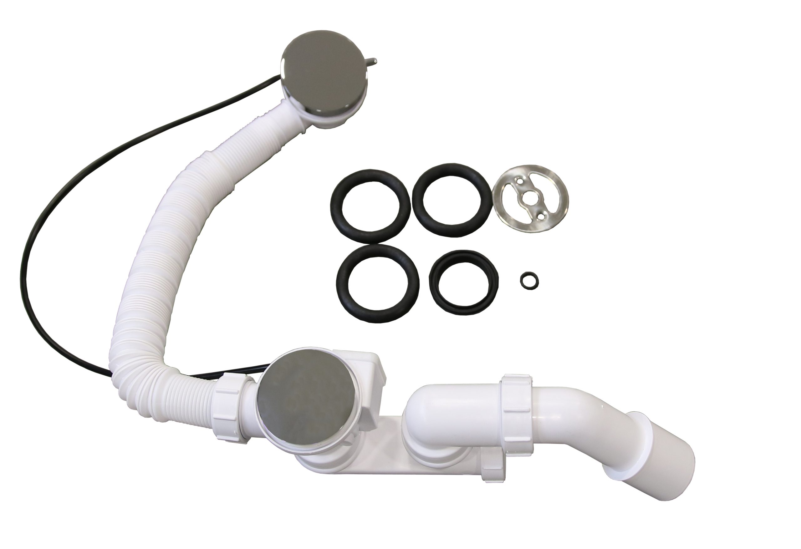 Sifon za samostojeće kade PRESTIGE s kabelskim mehanizmom zatvaranja/otvaranja. Fleksibilne cijevi s glatkom unutrašnjošću. Kromirani poklopci odvoda i preljeva. U kompletu s priključkom za odvodnu cijev i setom brtvi. Pogodno za model PRESTIGE i druge kompatibilne samostojeće kade.