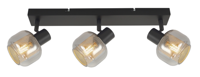 S tri sjenila, spot svjetiljka AMELIA pruža još snažnije i ravnomjernije osvjetljenje, a istovremeno unosi dozu luksuza i suvremenog dizajna u prostor. Sivo zadimljeno staklo osigurava ugodno, difuzno svjetlo, dok zlatna unutarnja mrežica stvara profinjenu igru svjetlosti i sjene. Crna metalna baza daje stabilnost i elegantan kontrast. Opremljena s tri E14 grla, savršen je izbor za veće dnevne boravke, blagovaonice, hodnike i ugostiteljske prostore.