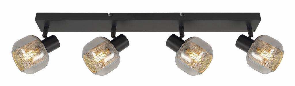 S četiri sjenila, spot svjetiljka AMELIA postaje moćan izvor svjetlosti koji ravnomjerno osvjetljava i veće prostore. Kombinacija crne metalne baze, sivo zadimljenog stakla i zlatne unutarnje mrežice donosi vrhunski spoj industrijskog i luksuznog stila. Opremljena s četiri E14 grla, podržava žarulje do 8W, što je čini idealnim rješenjem za prostrane dnevne boravke, blagovaonice, hodnike, restorane i kafiće koji žele postići elegantan i upečatljiv vizualni dojam.