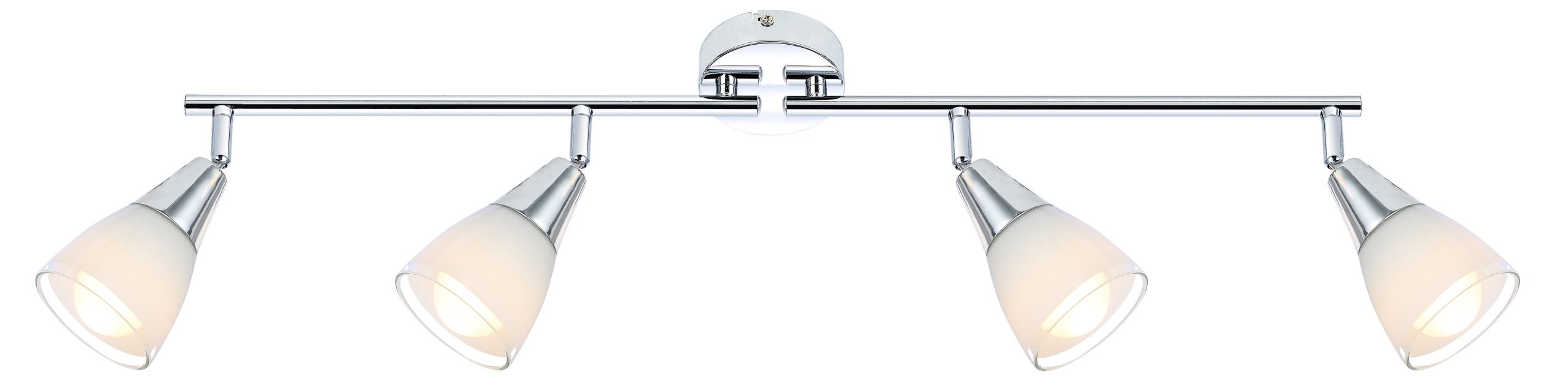 Višestruki spot s kromiranom metalnom bazom i četirima bijelim staklenim sjenilima. Savršen za prostore koji zahtijevaju jače i ravnomjerno raspoređeno osvjetljenje.