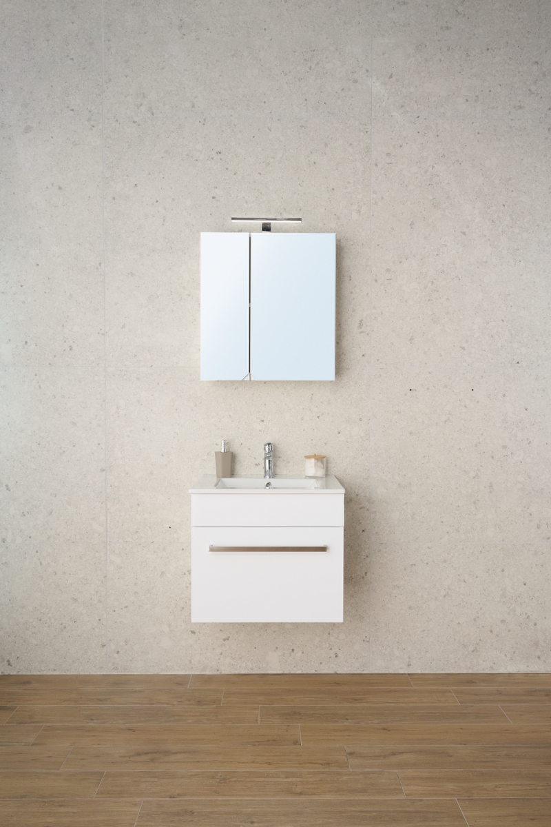 Donji ormarić kupaonskog kompleta TIA 60 u dekoru bijeli sjaj s jednom dubokom ladicom i keramičkim umivaonikom pruža dovoljno prostora za organizaciju i praktičnost u vašoj kupaonici. Inox ručkice u satin nikl mat boji dodatno ističu moderan izgled. Sifon se prodaje zasebno.