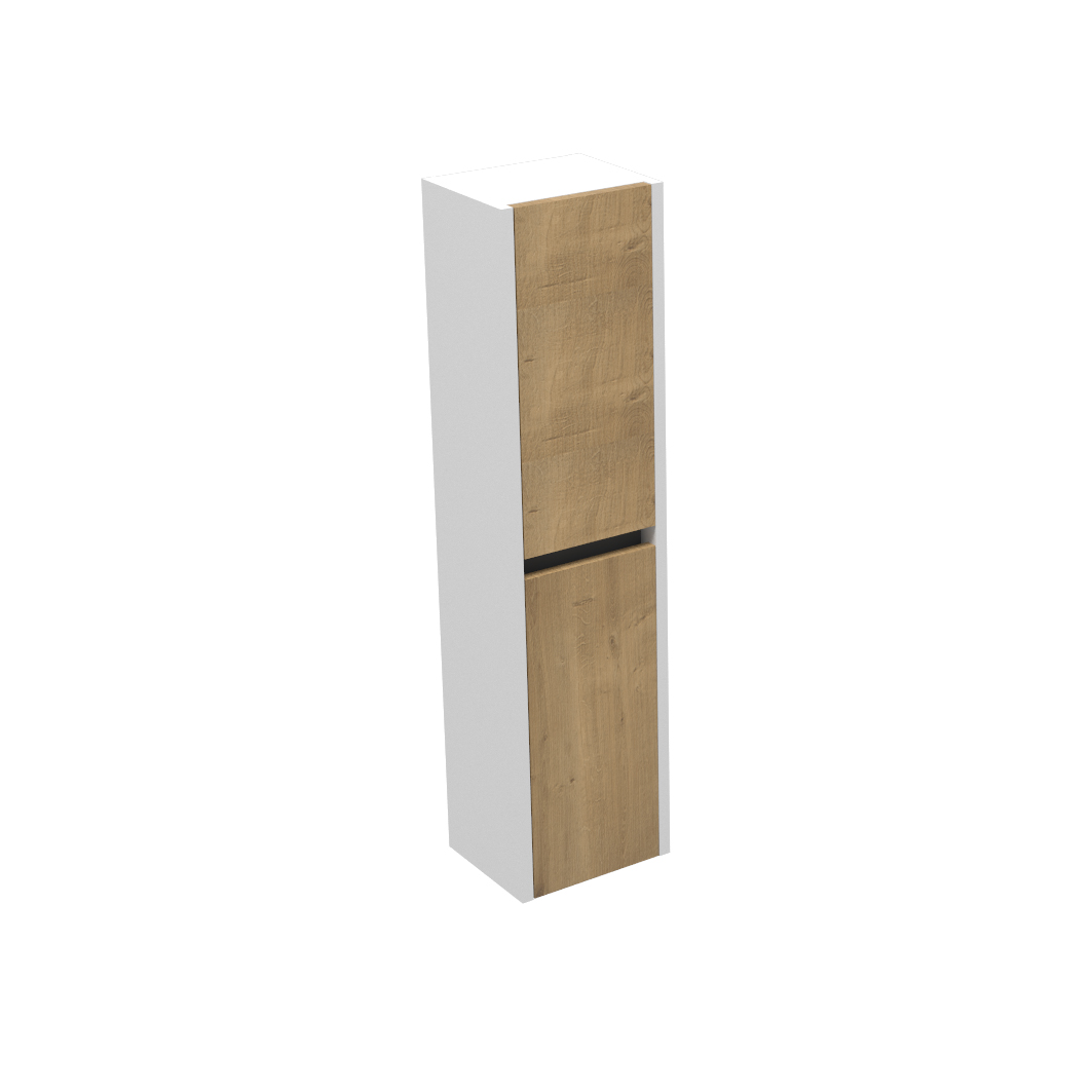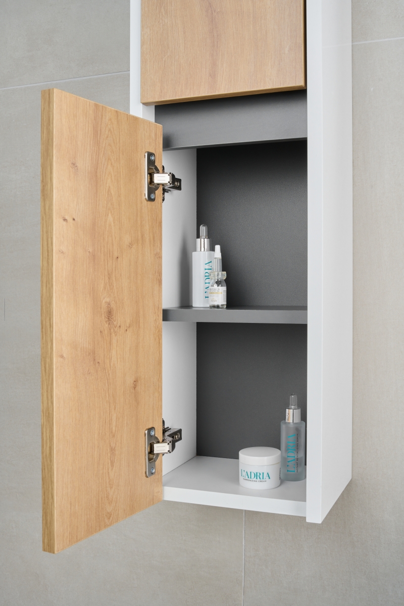 Bočni kupaonski ormarić serije Vital u bijelom sjaju s frontom u dekoru hrast authentic unosi prirodnu toplinu i svjetlost u vašu kupaonicu. Praktičan i kompaktan, pruža dodatni prostor za pohranu i organizaciju, savršen za svaki kupaonski prostor.
